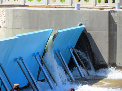 液壓壩既能達到橡膠壩能升能降的效果,又克服了橡膠壩安全性、可靠性、耐久性較差的缺點,使用壽命是橡膠壩的五倍以上,壩體以底部為軸,無中墩設計,放倒壩面后緊貼河床,排沙排漂效果好,再大的洪水都不會沖毀壩體,液壓活動壩面操作簡單方便,升降壩面速度快。